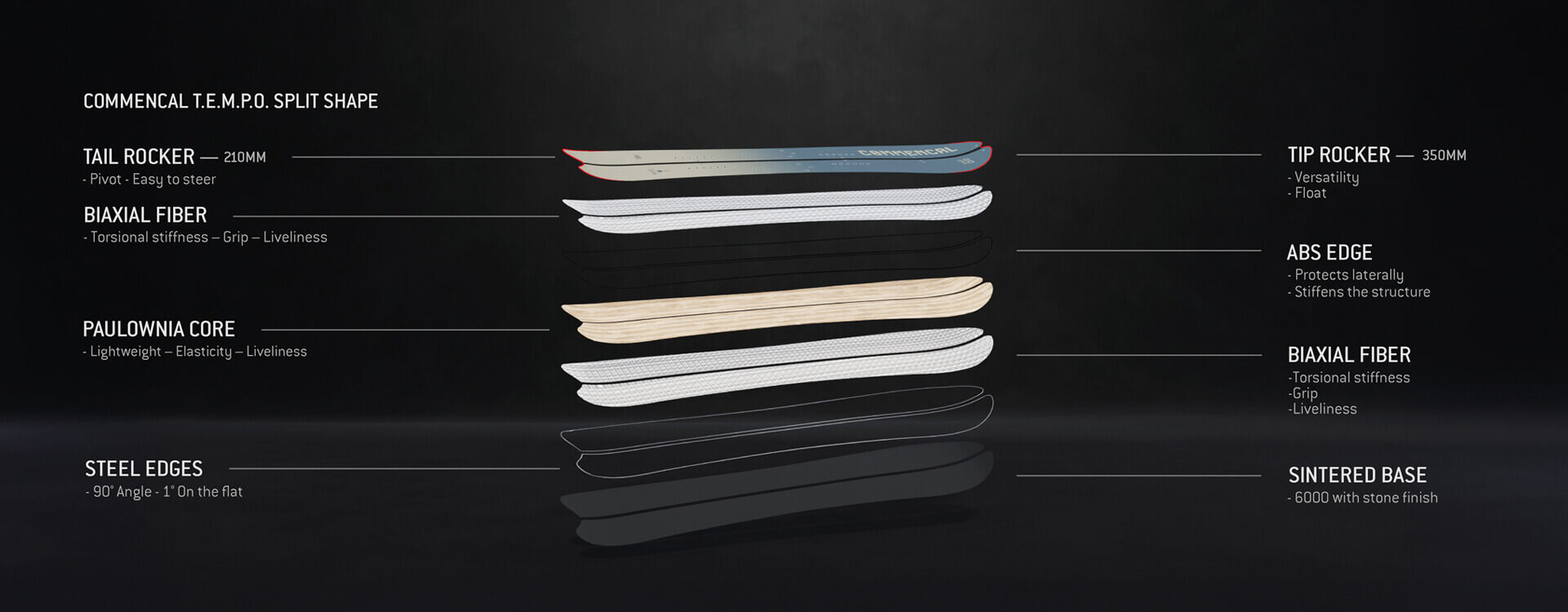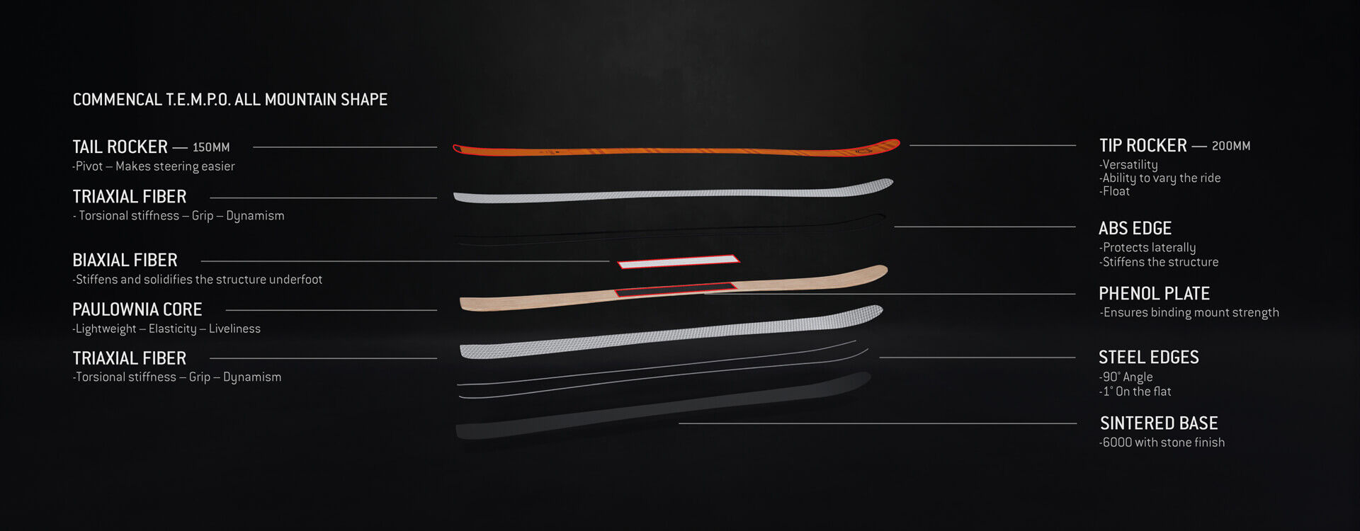 Light, forgiving, and responsive are three words that capture the T.E.M.P.O. spirit. But it goes beyond that, as we see these skis as an all-round option, from carving piste to touring. The new structure provides better stiffness to help improve performance on compact snow.
