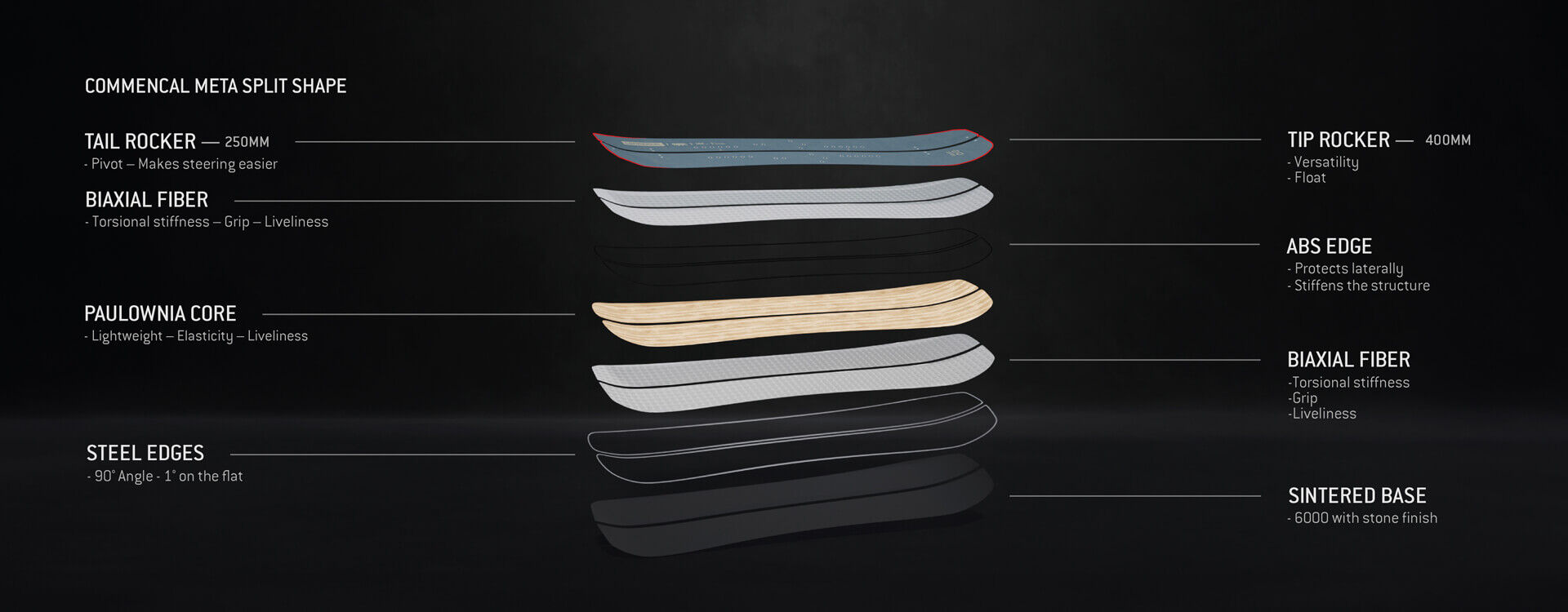 The principle of the CLASH leads us back to the essence of snowboarding. The simplicity of a well-carved powder slash, the sensation of a clean turn on the slopes… A short turn radius and double rocker brings versatile performance.