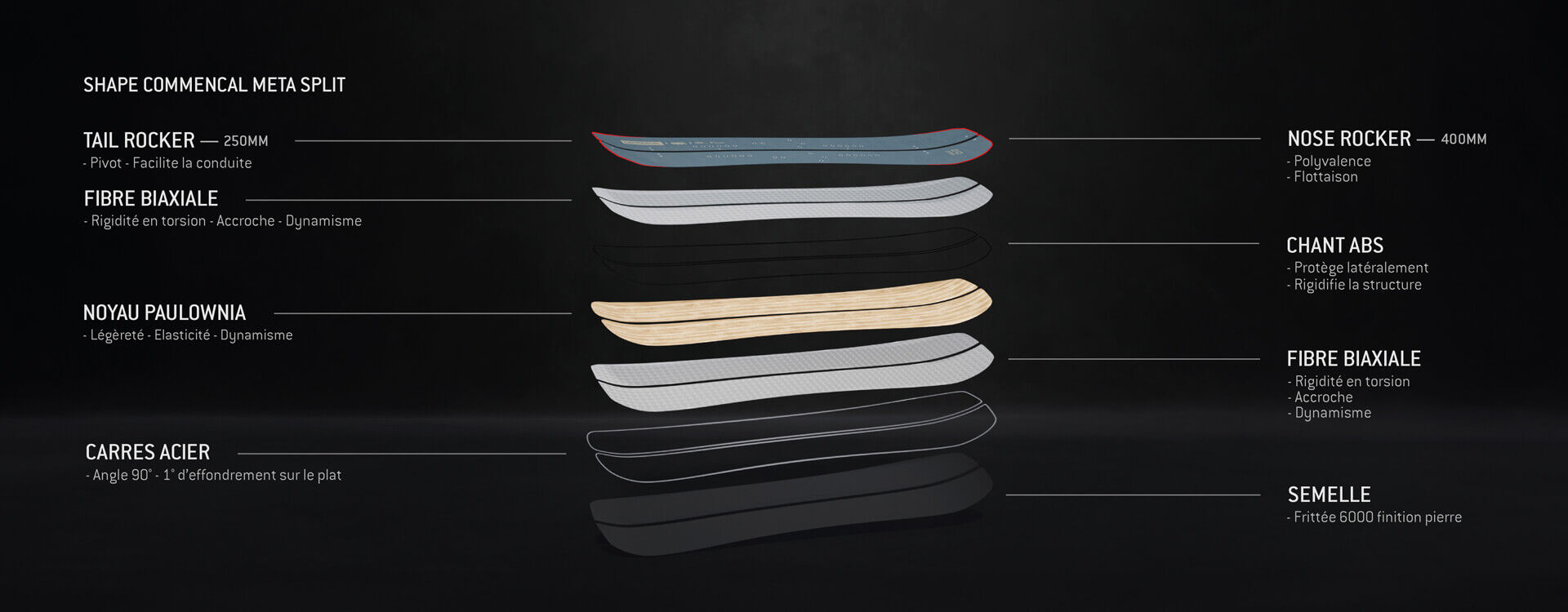 Le splitboard META dispose de lignes plus effilées pour plus de confort en traversée. Il permet d’aller plus loin dans la recherche de belles faces avec toujours le même objectif en tête ; le plaisir de la descente avec un shape travaillé pour tourner court et passer partout.