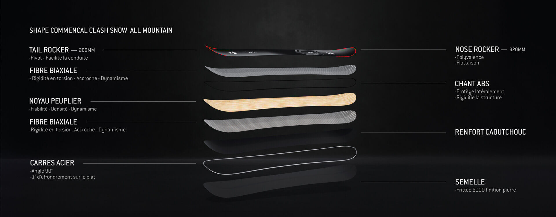 Le principe du CLASH est de revenir à l’essence du snowboard. La simplicité d’un slash bien appuyé en poudre, la sensation d’un beau turn coupé sur piste. Rayon court et double rocker pour un programme ouvert.