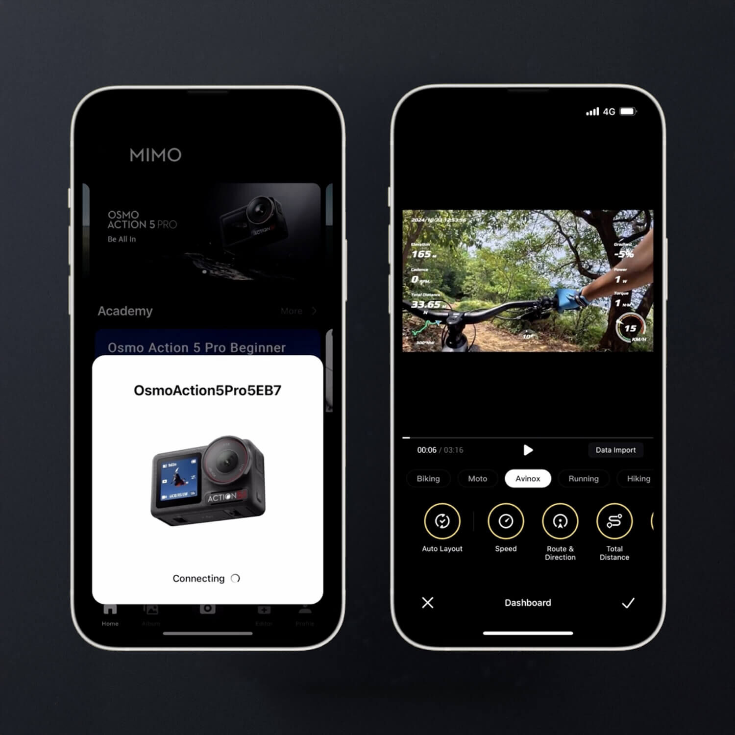 You can synchronise your AVINOX system with the Osmo Action 5 Pro camera to film your rides. Edit, customise the data overlays, and share via the MIMO app.