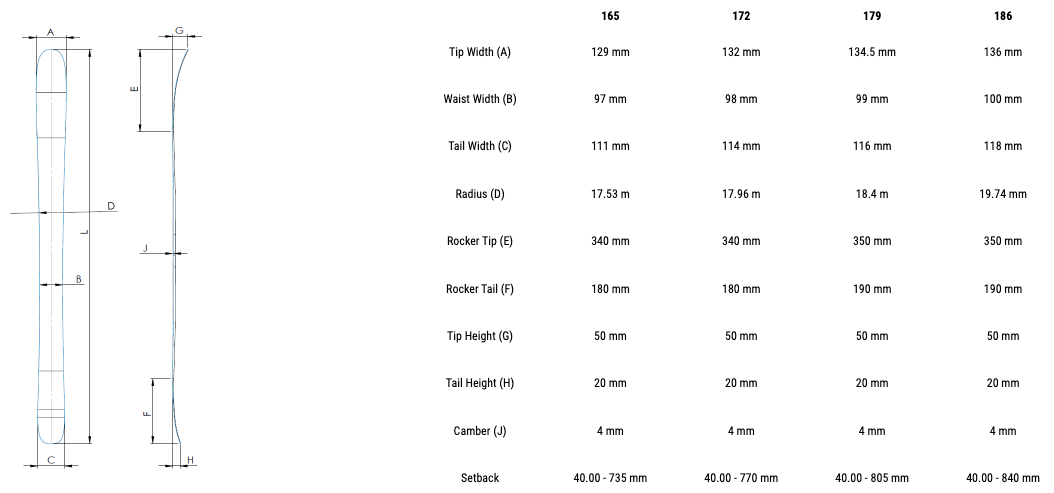 Le META se trouve à la croisée des chemins entre l’usage station et freeride. Assez large pour se faire plaisir dans les pentes vierges, assez étroit pour offrir de la réactivité en changement de courbe. Nous avons travaillé le shape pour le résultat suivant : un rayon court sur piste, et de la flottaison en neige profonde. Avec le double rocker, les possibilités d’ajustement de conduite et de placement sont incroyables et assurent de toujours trouver du confort malgré les changements de neige.